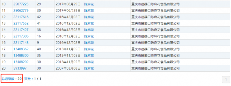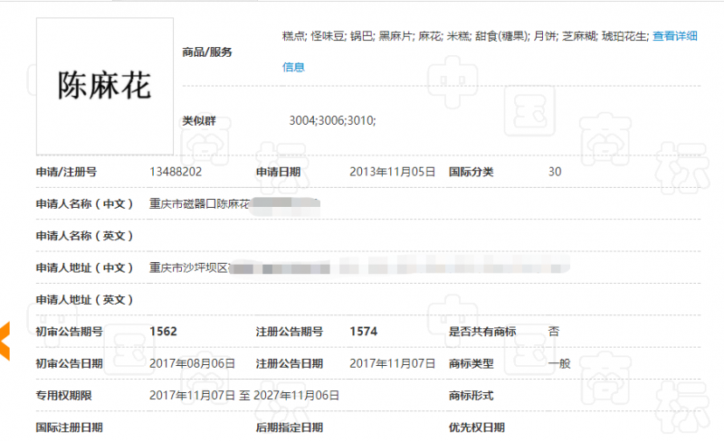 此后,陳麻花公司又在多個(gè)類(lèi)別布局了“陳麻花”、“陳麻花記憶”、“陳麻花磁器口”、“陳麻花陳昌銀”等相關(guān)商標(biāo)。