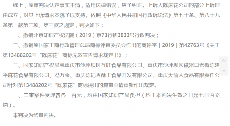 該終審判決書(shū)顯示,撤銷(xiāo)一審行政判決和商標(biāo)無(wú)效宣告請(qǐng)求裁定書(shū),要求國(guó)家知識(shí)產(chǎn)權(quán)局針對(duì)第13488202號(hào)“陳麻花”商標(biāo)提出的復(fù)審申請(qǐng)重新作出裁定。