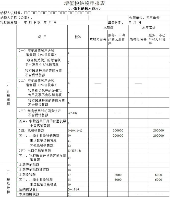 (二)填寫主表根據(jù)4號(hào)公告規(guī)定,《增值稅納稅申報(bào)表(小規(guī)模納稅人適用)》中的“免稅銷售額”相關(guān)欄次,填寫差額后的銷售額,因此第9欄填寫200000元。