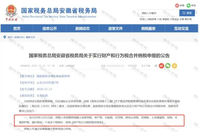 1、安徽省于11月23日發(fā)布了《關(guān)于實(shí)行財(cái)產(chǎn)和行為稅合并納稅申報(bào)的公告》