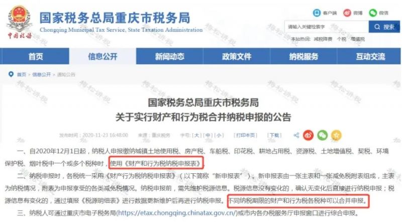 2、重慶市國稅局11月23日發(fā)布《關(guān)于實(shí)行財(cái)產(chǎn)和行為稅合并納稅申報(bào)的公告》