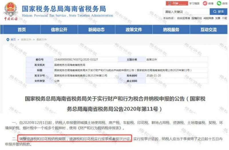 3、海南省國稅局11月20日發(fā)布《關(guān)于實(shí)行財(cái)產(chǎn)和行為稅合并納稅申報(bào)的公告》