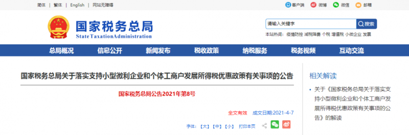代理記賬公司:近期,國家稅務(wù)總局發(fā)布了《關(guān)于落實(shí)支持小型微利企業(yè)和個(gè)體工商戶發(fā)展所得稅優(yōu)惠政策有關(guān)事項(xiàng)的公告》(國家稅務(wù)總局公告2021年第8號(hào),以下簡(jiǎn)稱《公告》)。