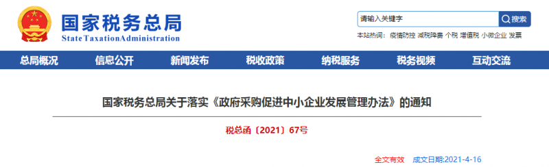 為落實《財政部?工業(yè)和信息化部關于印發(fā)〈政府采購促進中小企業(yè)發(fā)展管理辦法〉的通知》(財庫〔2020〕46號,以下簡稱《辦法》)要求,發(fā)揮政府采購政策功能,促進中小企業(yè)發(fā)展,結合稅務系統(tǒng)實際,現(xiàn)將有關事項通知如下:
