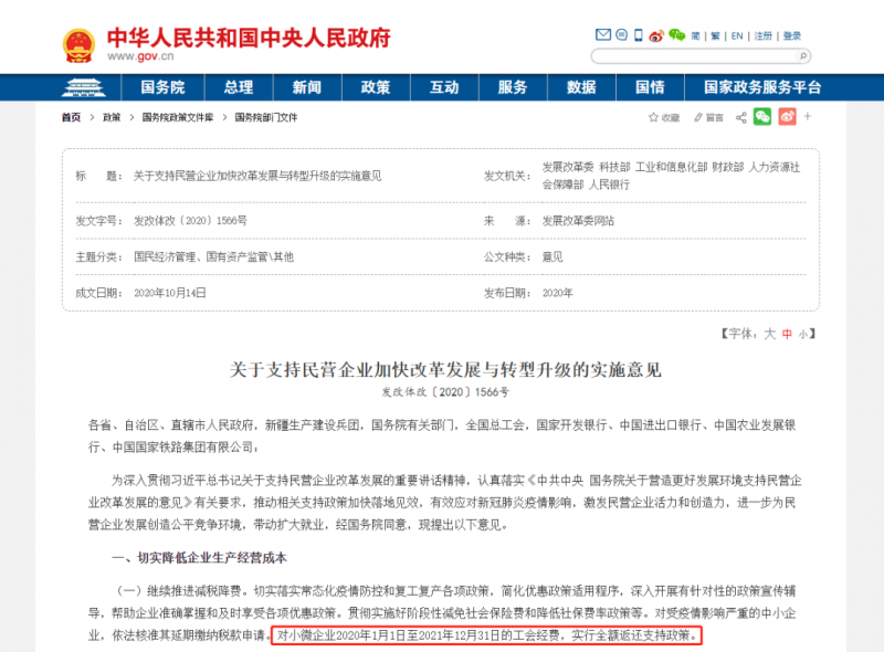根據(jù)《關(guān)于支持民營企業(yè)加快改革發(fā)展與轉(zhuǎn)型升級的實施意見》(發(fā)改體改〔2020〕1566號)規(guī)定,對小微企業(yè)2020年1月1日至2021年12月31日的工會經(jīng)費,實行全額返還支持政策。