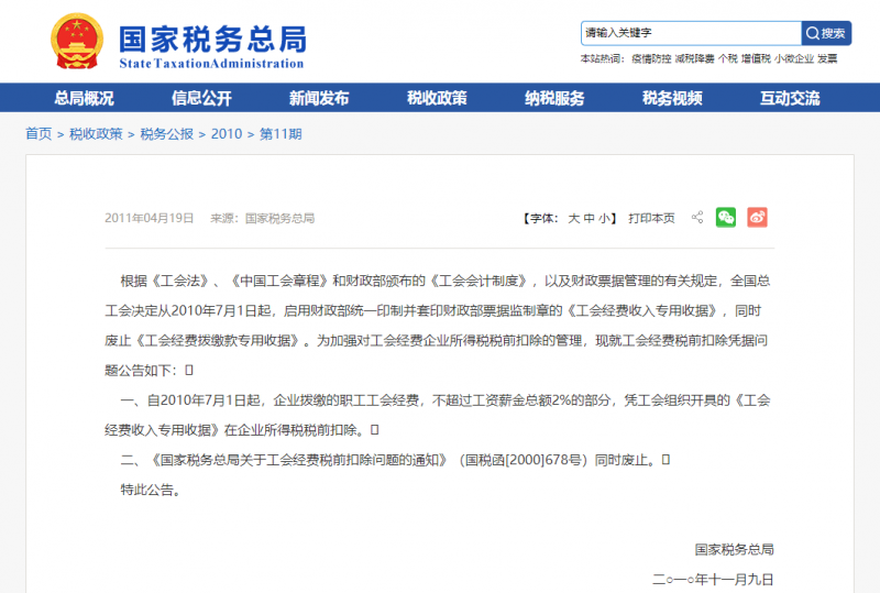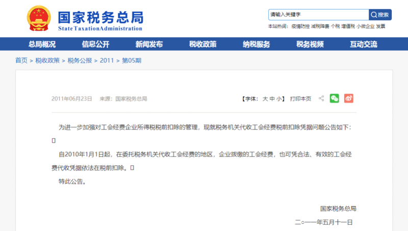 根據(jù)《國家稅務(wù)總局關(guān)于稅務(wù)機關(guān)代收工會經(jīng)費企業(yè)所得稅稅前扣除憑據(jù)問題的公告》(國家稅務(wù)總局公告2011年30號)規(guī)定,自2010年1月1日起,在委托稅務(wù)機關(guān)代收工會經(jīng)費的地區(qū),企業(yè)撥繳的工會經(jīng)費,也可憑合法、有效的工會經(jīng)費代收憑據(jù)依法在稅前扣除。