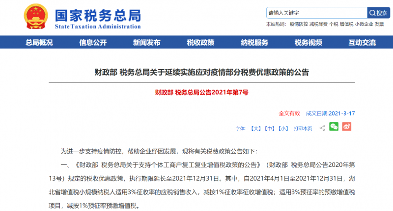二、小規(guī)模納稅人增值稅征收率為3%降1%政策延續(xù)。