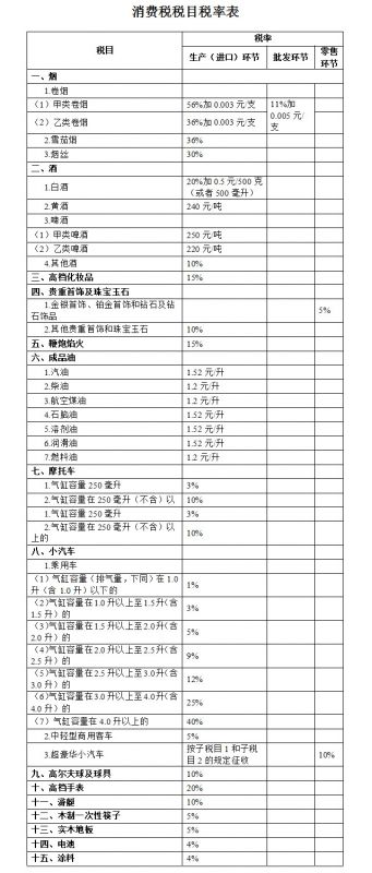在消費(fèi)稅稅目稅率表中總共涉及15類商品,包括煙、酒、高檔化妝品、貴重首飾及珠寶玉石、鞭炮焰火、成品油、摩托車、小汽車、高爾夫球及球具、高檔手表、游艇、木制一次性筷子、實(shí)木地板、電池和涂料。
